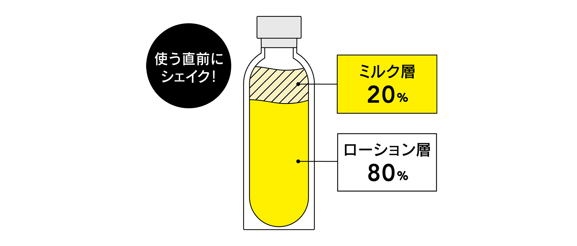 化粧水と乳液が1本になった2層式のミルク化粧水。肌の保湿管理に着目した「ミルク層:ローション層=2:8」のベストバランスで、保水と貯水*²を両立します。ローション層が角質層のすみずみまで浸透し潤いを届け、ミルク層でヴェールを作り水分蒸散を防いでラッピング。気になる毛穴*¹やくすみ*³をケアしながら、乾燥や肌荒れを予防して美肌をサポートします。